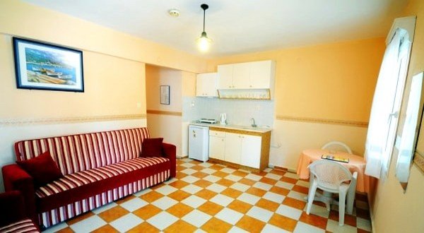 ve havuz manzarasına sahip olan apart odalarda klima, buzdolabı, TV, mutfak