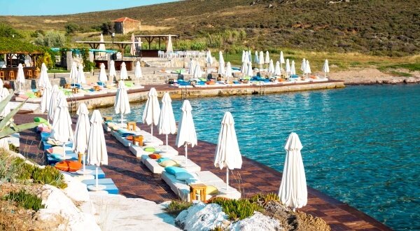 koyda yer alan ve tek otel olan Pelagos sahilinde Ege'nin harika denizi ile