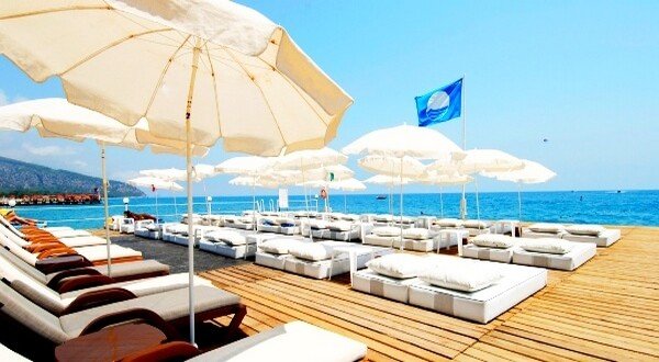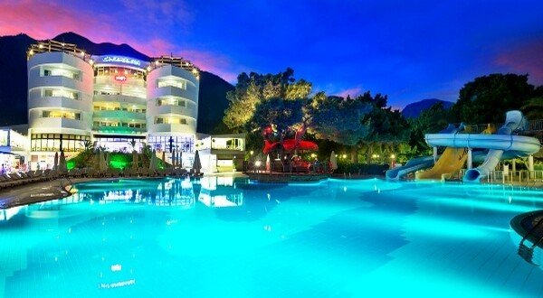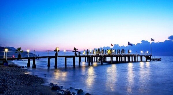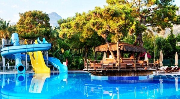 Geniş bir sahil şezlonglar şemsiyeler, özel iskele ve su kaydıraklı havuz keyfi. Bu yaz Kemerde ucuz otel tatil fırsatı.