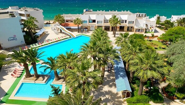 limanına 5 km, denize sıfır, su kaydıraklı, bayanlar ve erkeler için ayrı havuzları olan ve Adnan Menderes havalimanına sadece 90 km uzaklıkta, Ailenizle helal bir tatil için keyifli otel Familia Çeşme.