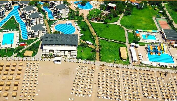 Sahile Direk Ulaşım ( 270m uzunlukta) , 6 Havuzlu, 1 Ana Havuzu, 1 Relax,1 Çocuk Havuzu, 1 Kaydıraklı Havuzu, 1 Aktivite Havuzu ve Gece kulübü